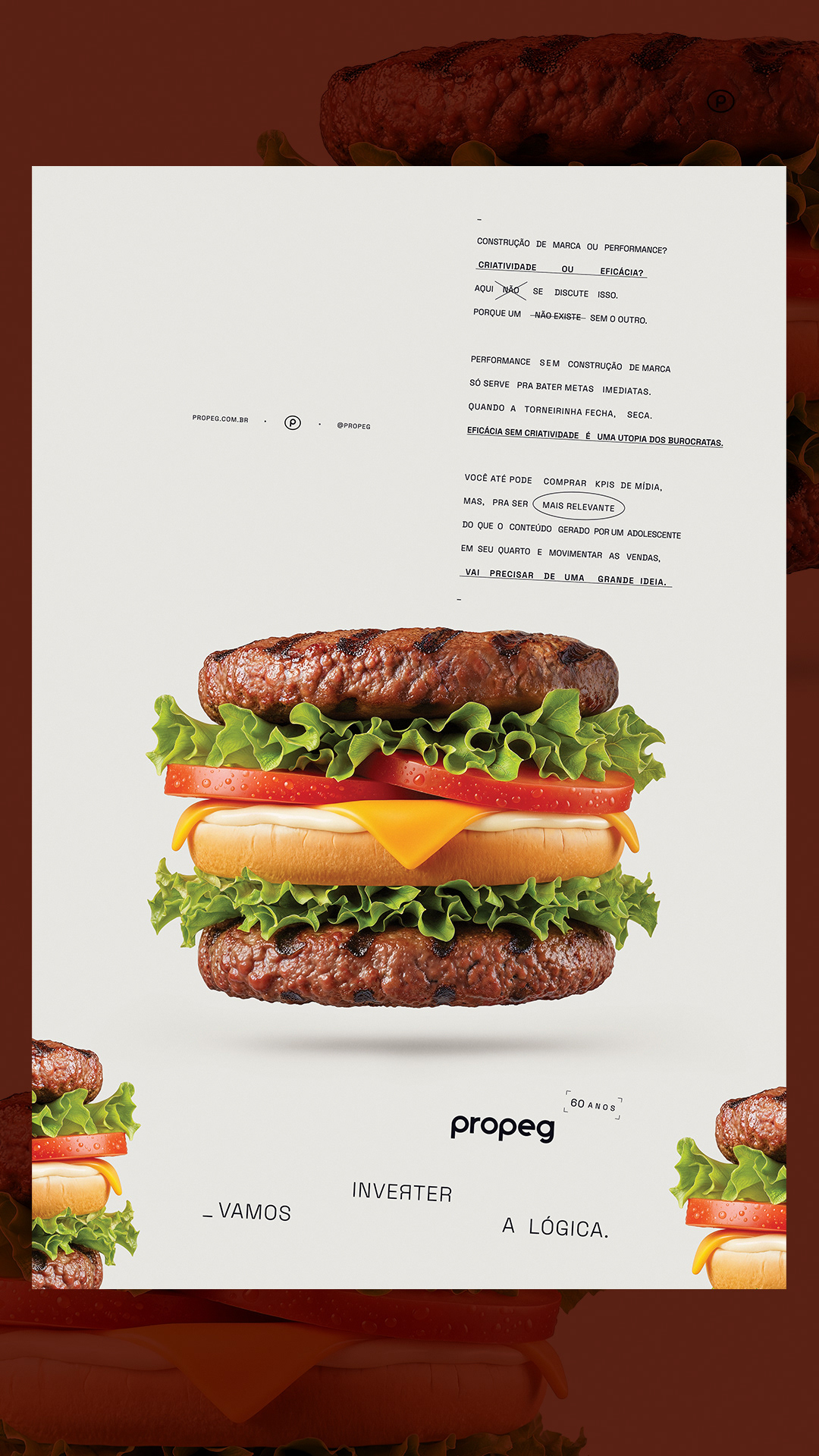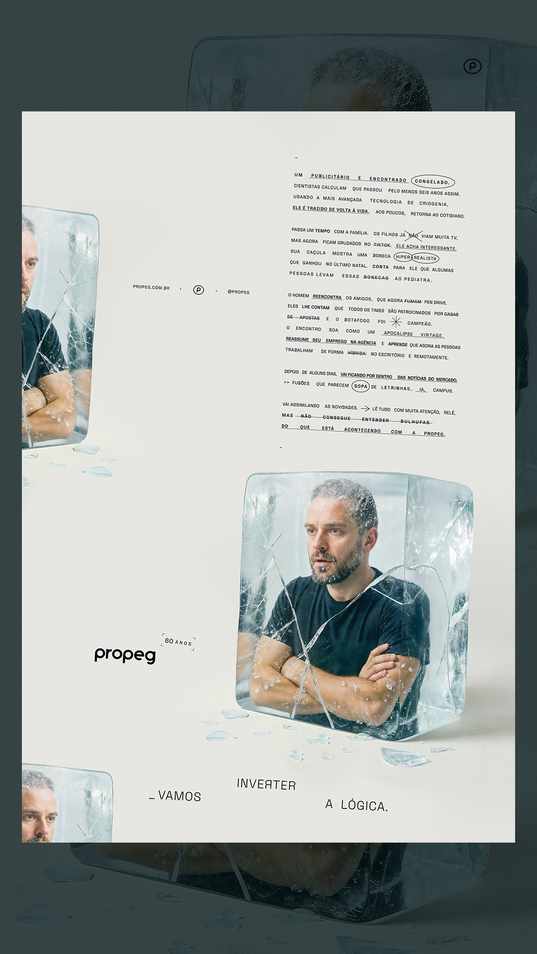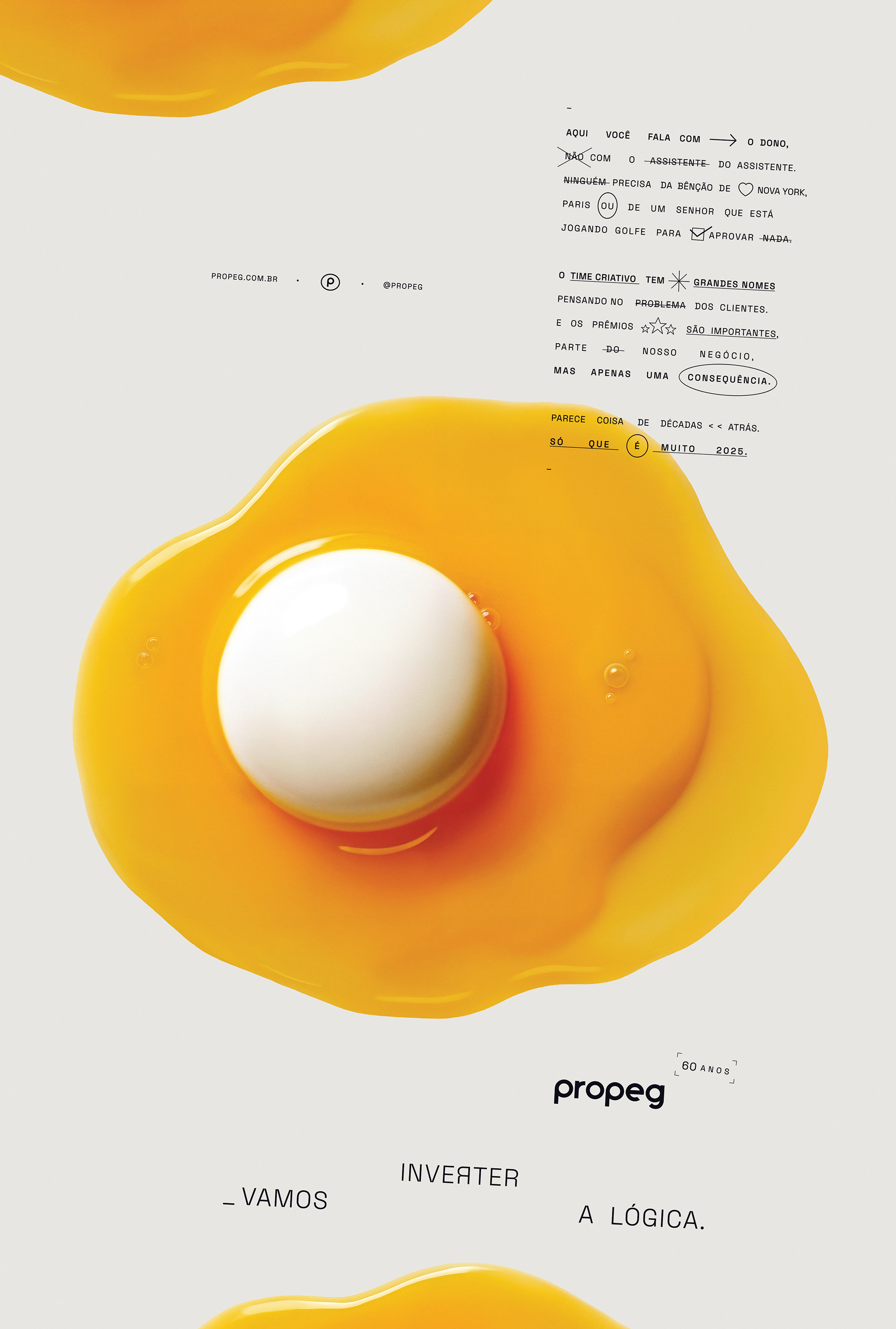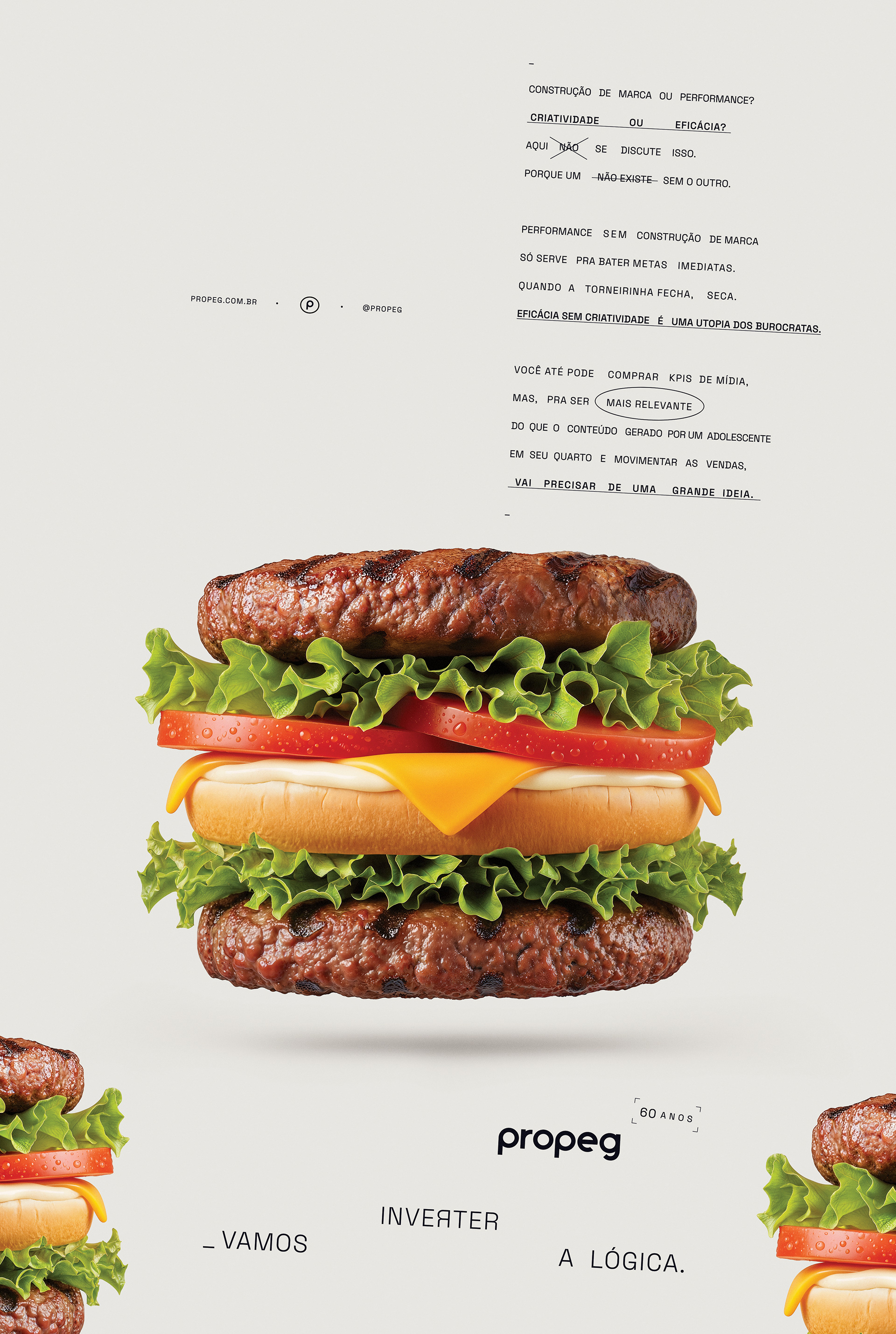 Para comemorar seu 60º aniversário, a Propeg lança um novo posicionamento ousado: “Vamos inverter a lógica”. A campanha reintroduz o DNA criativo da agência por meio de uma série de visuais e filmes surreais e instigantes que literalmente invertem a realidade. Cada peça reflete a missão da agência: desafiar o convencional, repensar o que é possível e lembrar ao setor que a criatividade ainda lidera o caminho. “Após seis décadas, não queríamos celebrar o passado”, diz Propeg. “Queremos questionar o futuro.”